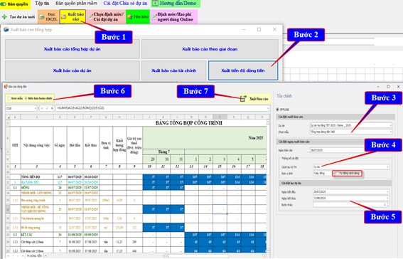 • Ngoài ra, có thể chọn báo cáo tổng hợp dự án, từng giai đoạn, hoặc tài chính tùy nhu cầu.