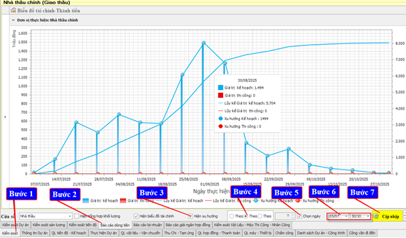 Biểu đồ tài chính giúp theo dõi trực quan giá trị thi công theo ngày, so sánh giữa kế hoạch và thực tế, đồng thời thể hiện xu hướng lũy kế của dòng tiền. Mục tiêu là kiểm soát sát sao tiến độ tài chính và đánh giá mức độ bám sát kế hoạch theo từng giai đoạn thi công.