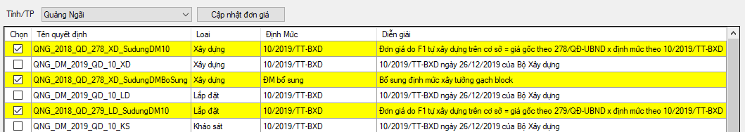Sau khi tra lại bảng tính thì bảng “Công trình” tính toán lại theo đúng đơn giá gốc của sở công bố mà cụ thể ở trên là theo QĐ 535 XD của Quảng Ngãi có hiệu lực 20/10/2016 và QĐ 278/2018 sử dụng Thông tư 10 của BXD