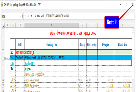 Xem rõ thông tin: mã hiệu công tác, tên công tác, đơn vị, đơn giá, khối lượng, giá trị thành tiền... được hiển thị rõ ràng giúp người dùng dễ kiểm tra trước khi đồng ý.