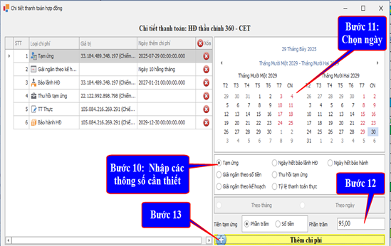 Ví dụ: Tạm ứng 95% theo ngày 29/07/2025 thì bạn chọn “Tạm ứng”, nhập “95%” và chọn ngày tương ứng.