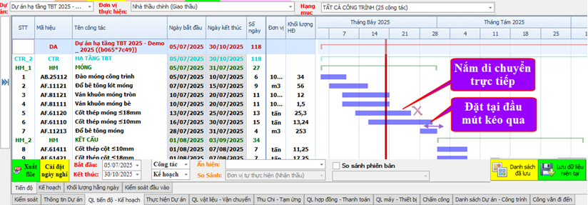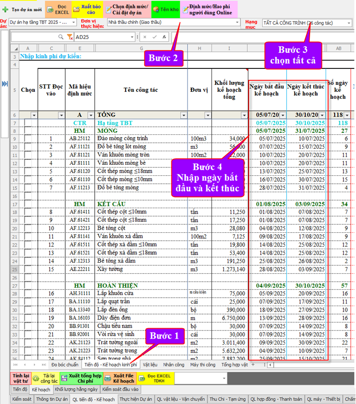 Cách 1: Tại tiến độ kế hoạch chọn “Thầu chính” chọn “Tất cả công tác” nhập ngày bắt đầu và kết thúc cho từng công tác.