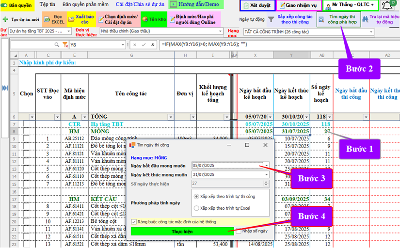 Cách 2: Tại tiến độ kế hoạch không nhập từng công tác mà đặt chuột tại dòng HM chọn vào “Tìm ngày thi công phù hợp” và nhập  ngày bắt đầu, kết thúc và chọn “Thực hiện”.
