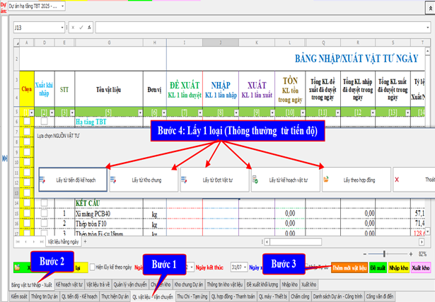 Từ giao diện chính, chọn tab “Quản lý vật liệu – Vận chuyển”