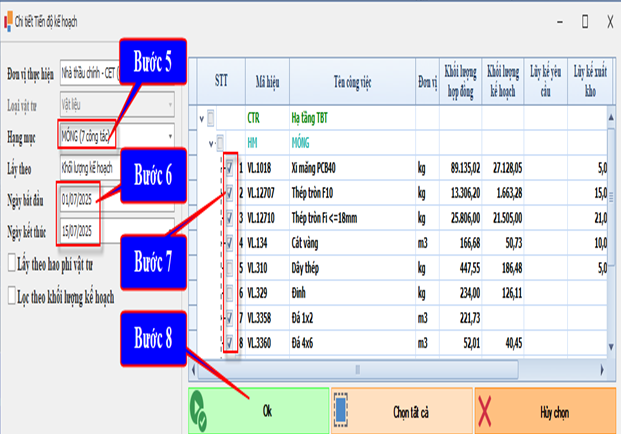 Cho phép bạn lọc và chọn nhanh các loại vật tư cần sử dụng theo từng hạng mục công việc, trong khoảng thời gian thi công cụ thể, dựa trên khối lượng đã được lập kế hoạch. Đây là Bước quan trọng giúp đảm bảo tiến độ cung ứng vật tư chính xác, sát với thực tế thi công từng giai đoạn theo các Bước tiếp theo.