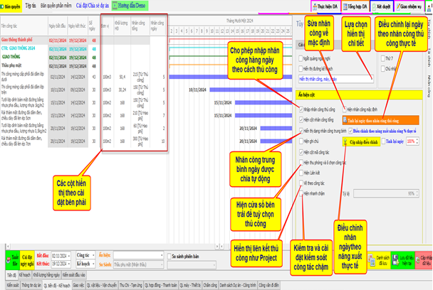 Các lệnh được thực hiện bằng cách nhấn vào, khi đó một cột bên trái sẽ xuất hiện để bạn nhập thông tin. Nếu sử dụng nút Tính lại nhân công thủ công, bạn cần nhập lại số lượng nhân công hàng ngày cho một công tác cụ thể. Sau khi điều chỉnh, nhấn nút này, hệ thống sẽ tự động điều chỉnh ngày kết thúc dựa trên nhân lực thực tế mà bạn đã nhập.