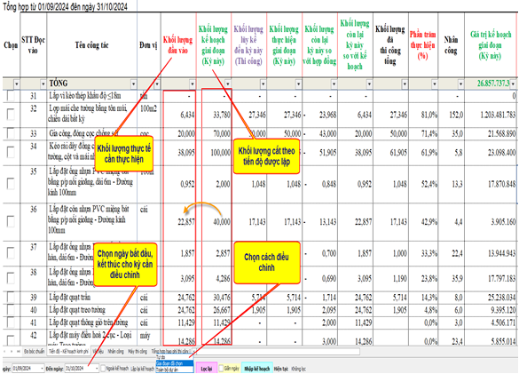 + Tại chế độ lọc của bảng “Tiến độ - Kế hoạch” chọn thời gian Kỳ Tiến Độ mà bạn muốn điều chỉnh (ví dụ: quý 1, quý 2) và lựa chọn cách điều chỉnh