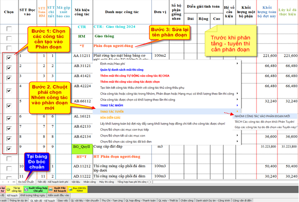 Trước khi thực hiện được chia tầng – tuyến thì cần thực hiện phân đoạn tại bảng đo bóc chuẩn với nhà thầu đó trước khi quay lại bảng phân khai để thực hiện lệnh này
