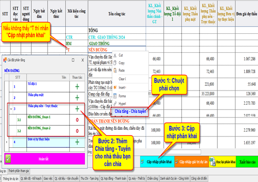 Tại bảng này tiến hành chuột phải tại dòng *T để chọn “Chia tầng – chia tuyến” và lựa chọn nhà thầu cần chia, tại đây sau khi chia, sửa lại tên tuyến sau chia thì nhấn hoàn tất