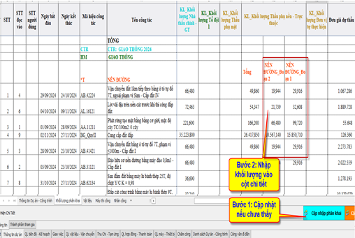 Thực hiện xong Bước trên thì tiến hành nhập khối lượng vào cột chi tiết cho nhà thầu vừa chia tuyến ở Bước trước