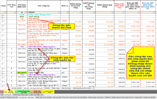 Lưu ý: Bây giờ khối lượng thi công hàng ngày sẻ không nhập được cho công tác chính nữa mà chỉ nhập được cho các tuyến đã chia