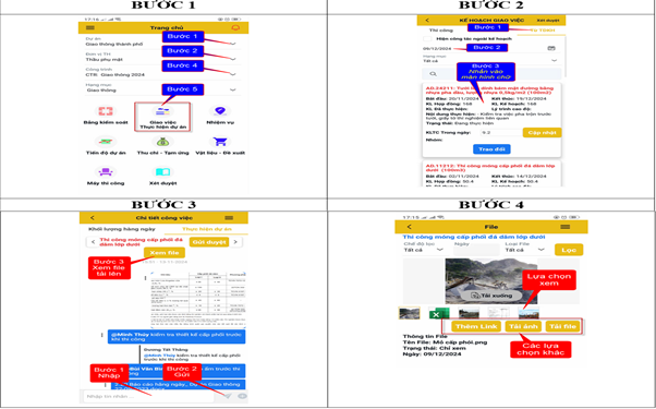 Đối với phiên bản di động, sau khi bạn mở ứng dụng trên điện thoại, bạn sẽ được yêu cầu chọn khóa mà mình tham gia. Tiếp theo, chọn dự án mà bạn muốn thực hiện. Một khi dự án đã được chọn, bạn sẽ được đưa đến giao diện để chọn một thầu phụ cụ thể. Thầu phụ này có thể là một phần việc cụ thể cần thực hiện trong khuôn khổ dự án. Sau khi chọn thầu phụ, hệ thống sẽ cung cấp cho bạn một loạt các bước chi tiết cần làm để hoàn thành nhiệm vụ được giao.