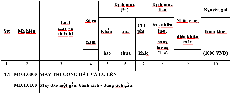 1. Giá ca máy gồm toàn bộ hoặc một số các khoản mục chi phí như chi phí khấu hao, chi phí sửa chữa, chi phí nhiên liệu, năng lượng, chi phí nhân công điều khiển và chi phí khác của máy.