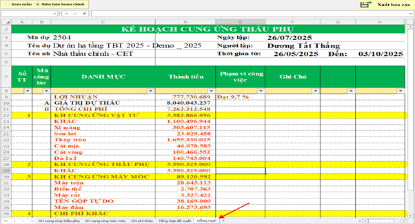 • Hệ thống sẽ tự động tổng hợp các chi phí tạm tính (bao gồm: chi phí thầu phụ, vật tư, nhân công, thiết bị, chi phí chung, chi phí khác, thuế, v.v.).