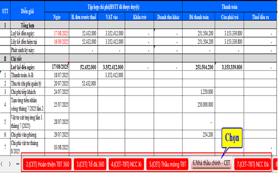 Thể hiện trên chi tiết chi phí của 1 nhà thầu